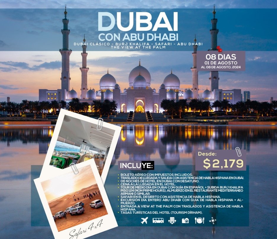 Vacacionar en Dubai y Abu Dabi es una experiencia que fusiona la opulencia moderna con la rica herencia cultural. En Dubai, la arquitectura impresionante incluye el Burj Khalifa y el Burj Al Arab, mientras que Abu Dabi destaca por la Gran Mezquita Sheikh Zayed.